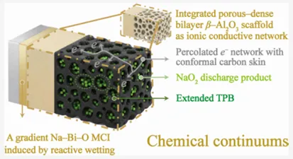 高能量密度、可持续的储能需求使钠‑氧(Na‑O₂)电池成为研究前沿,其理论能量密度约 1100 W h kg⁻¹,且钠地壳丰度高、成本低,是下一代电网级储能的理想选择,学界也已阐明其电化学反应主要围绕 NaO₂和 Na₂O₂的生成与分解展开,但液态 Na‑O₂电池受限于有机电解液的化学不稳定性,超氧自由基易引发副反应形成绝缘层、提升过电位,还存在电解液易燃泄漏、钠枝晶穿透的安全隐患。全固态钠‑氧电池采用 β‑Al₂O₃等陶瓷电解质,虽能从本质上解决枝晶和电解液稳定性问题,却面临固‑固界面的 “界面瓶颈”,传统设计中界面呈点接触状态,离子通量受限、界面阻抗大,充放电过程中还会产生化学机械应变导致界面层状,正极缺乏集成的三相边界限制活性位点利用,负极金属钠因表面张力高在陶瓷表面润湿性差,引发电流分布不均和电池提前失效,各类有机中间层的改性尝试又会牺牲陶瓷电解质的化学稳定性和高温耐受性,成为全固态钠‑氧电池实用化的关键阻碍。