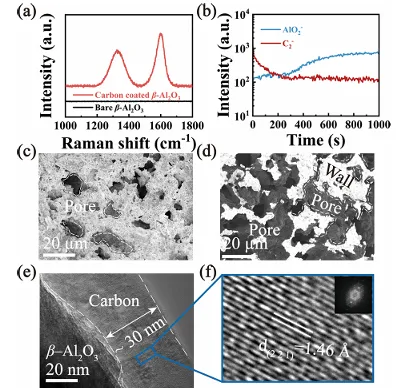 图 2 为单片双层 β‑Al₂O₃电解质的结构表征图,多维度验证了等离子体增强化学气相沉积制备的碳层与陶瓷骨架的复合结构特性,拉曼图谱证实了类石墨碳层的成功沉积,飞行时间二次离子质谱深度分析明确了碳层的厚度,扫描电镜对比呈现了多孔骨架涂覆碳层前后的微观形貌变化,透射电镜与高分辨透射电镜则清晰展现了碳 /β‑Al₂O₃界面的截面结构与石墨晶格条纹,全方位证明了 30 纳米厚的共形碳层均匀覆盖在陶瓷孔壁,且未破坏陶瓷基底的微观结构。