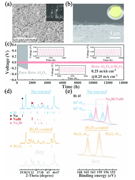 图 3 为反应性钠‑铋‑氧界面相的表征与电化学稳定性图,通过多种表征手段验证了氧化铋改性界面的结构与性能优势,扫描电镜呈现了氧化铋纳米片涂层的表面与截面形貌及元素分布,钠‑钠对称电池的恒电流循环测试对比了裸态与氧化铋改性 β‑Al₂O₃电解质的循环寿命,改性后的电池实现超 14000 小时的稳定循环,X 射线衍射与 X 射线光电子能谱则明确了钠接触后界面生成了钠铋合金与氧化钠相,证实了梯度钠‑铋‑氧混合导电界面相的形成。