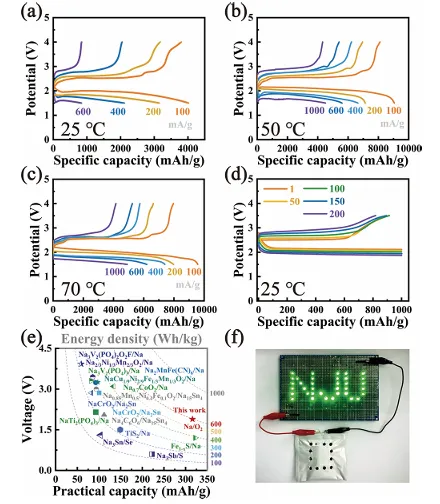 图 4 为全固态钠‑氧电池的电化学性能与实际应用性图,系统分析了电池在不同温度、不同电流密度下的充放电性能与实际应用潜力,分别给出了 25℃、50℃、70℃下电流密度从 100 至 1000mA g⁻¹ 的恒电流充放电曲线,体现了电池良好的倍率性能与热稳定性,固定容量下的长循环测试验证了电池的循环稳定性,拉贡图对比了该工作与已报道全固态钠金属电池的实际容量、平均输出电压和质量能量密度,实际软包电池驱动发光二极管阵列的光学图像则证明了电池的实用化可行性,其实际能量密度可达 597W h kg⁻¹。