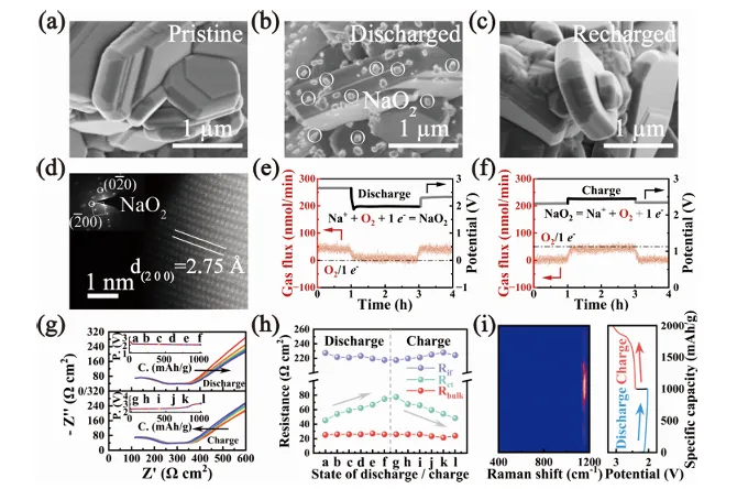 图 5 为全固态钠‑氧电池的反应机理分析图,结合多种原位与非原位表征手段阐明了电池的电化学反应机制与界面动态变化,扫描电镜捕捉到正极在原始、完全放电、充电后的形貌演变,证实放电产物二氧化钠可完全分解,球差校正透射电镜结合选区电子衍射明确了放电产物为晶态二氧化钠,差分电化学质谱分析了充放电过程中的气体演化动力学,证实单电子氧化还原反应的高可逆性,原位电化学阻抗谱监测了充放电不同阶段的阻抗变化,原位拉曼图谱则捕捉到二氧化钠特征信号的出现与消失,且全程未检测到过氧化钠信号,证明固态环境稳定了亚稳态二氧化钠相。
