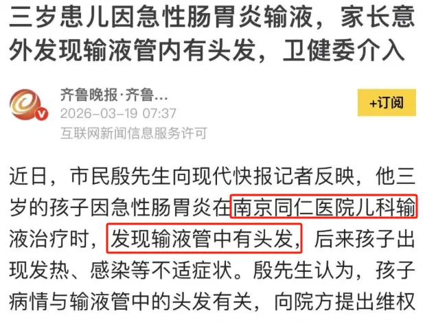 三岁患儿因急性肠胃炎输液,家长意外发现输液管内有头发,卫健委介入