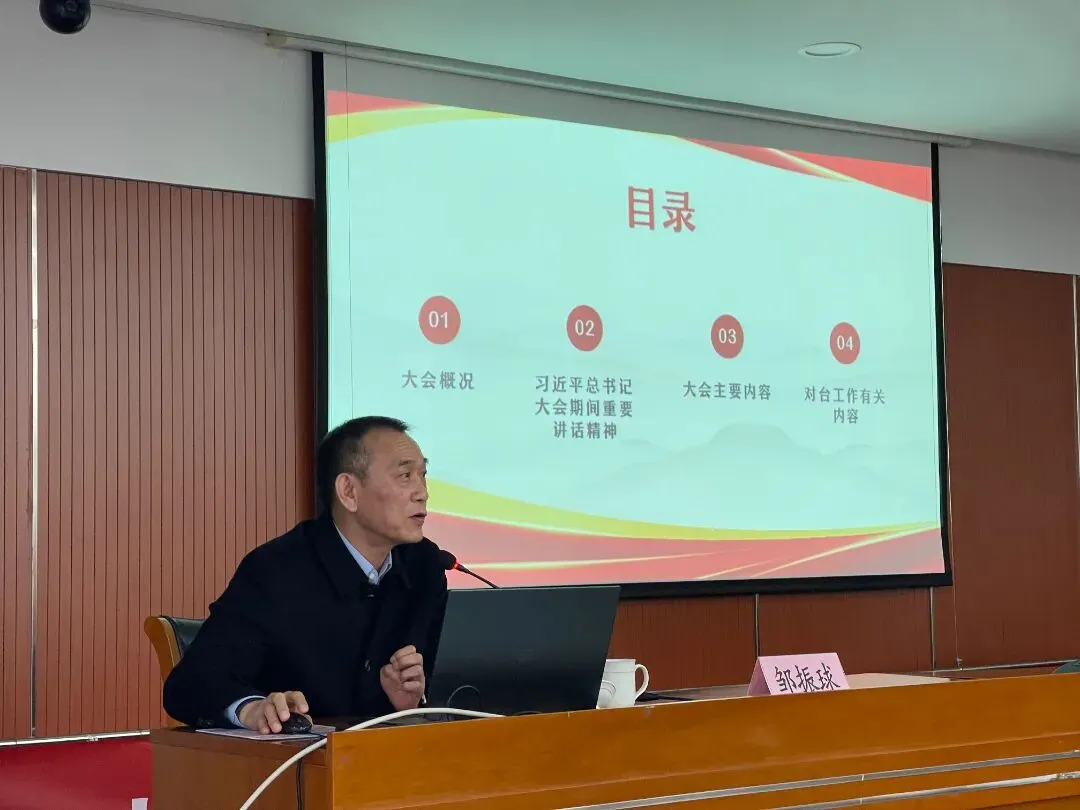 邹振球在会上传达了习近平总书记在全国两会期间的重要讲话精神,系统解读了政府工作报告和“十五五”规划纲要的战略导向。他详细介绍了台湾省代表团在本次大会期间的履职情况,并结合自身参会感受,分享了在审议各项报告和提出建议过程中的心得体会。