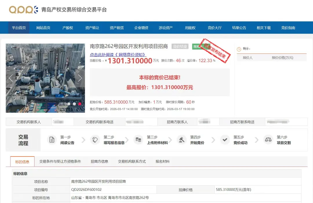 该项目资产价值约占我市2026年度闲置资产盘活总量的三分之一,前期经与50余家国内资产盘活头部企业招商洽谈,通过方案评审及竞价相结合方式,最终以1301.31万元/年价格成交,溢价率122.33%,创青岛产交所招商类项目溢价率新记录,实现国有资产大幅增值。