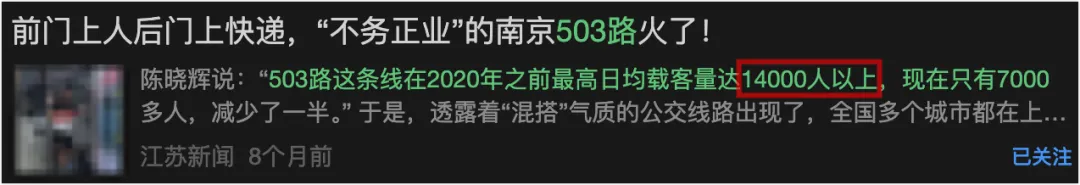 503路公交线在2020年之前最高日均载客量能够达到1.4万人以上,即便是现在也有7000多人”。