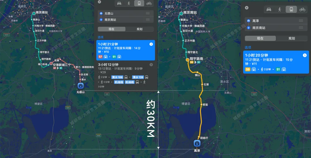 这导致一个很夸张的结果,溧水南边约30公里的高淳,在轨道交通层面到南京南站的通勤时间和溧水居然是同一水平,都是约1小时20分钟,甚至S9比S7还要快1分钟。
