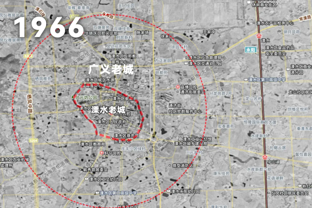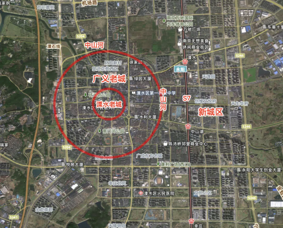 当然随着后来城建和人口的扩张,城市范围逐渐越过城墙和护城河,我们基本上可以将中山河以西的区域看作是广义上的老城,也是溧水人口最集中最稠密的区域。