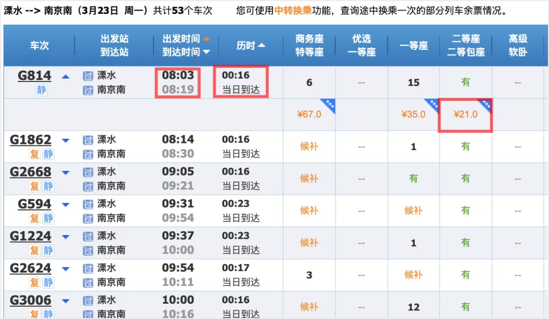高铁最早的班次是8点03分,16分钟就到南站了,二等座21块,虽然贵一些,但效率极高,对于不少9点钟上班的公司来说,坐高铁去南京市区上班显然是不错的选择。