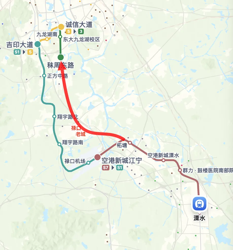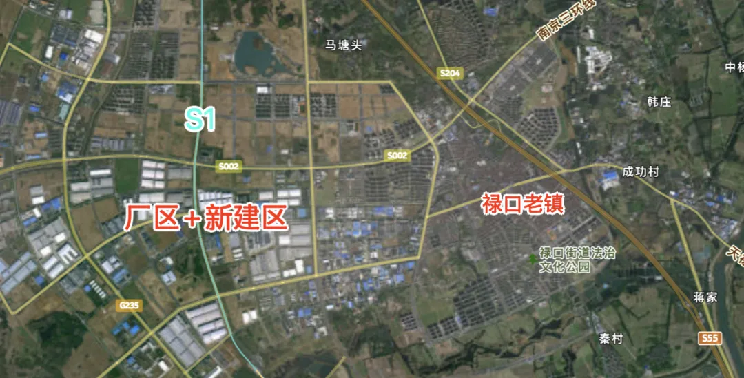 现有通过S1号线的串联,我总觉得稍显单薄,毕竟S1途经的区域大多并非江宁的主要核心,也没有从正方新城的中间穿过,包括经过禄口的路线,所过之处大多为厂区或新建区,而人口稠密的禄口老镇在东侧。
