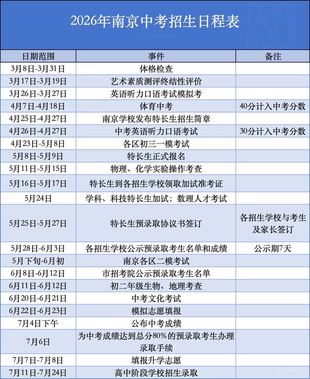 今年的中考正好巧遇端午小长假,今年中考时间为6月20至21日,以下是南京某校发布的2026年中考招生日程表。