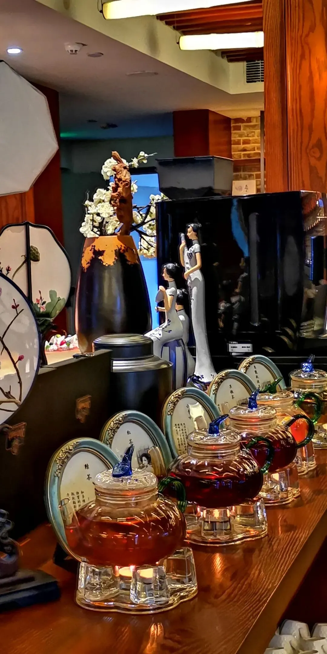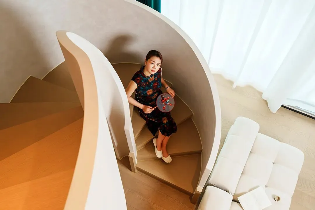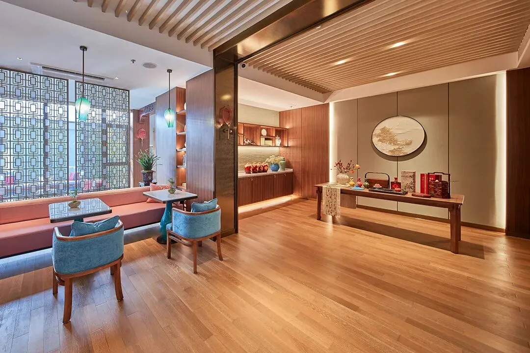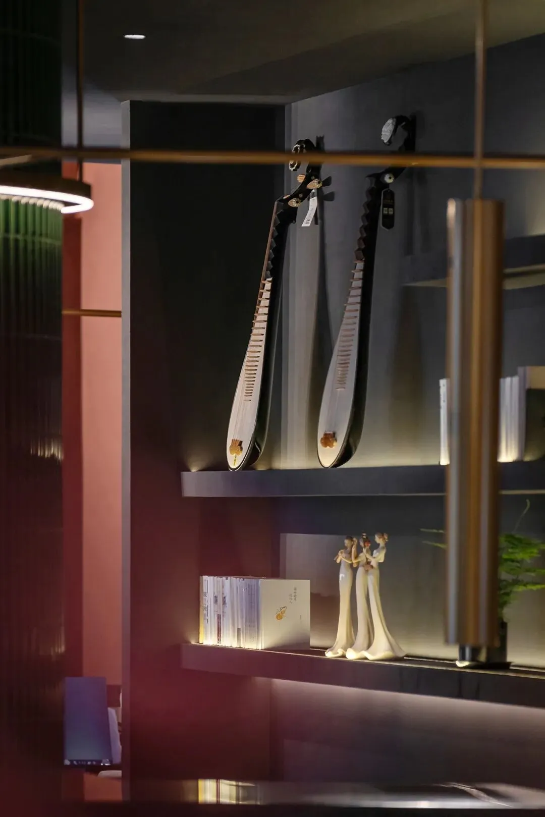 步入室内,又是一番创意天地。红墙、苏式花窗、琵琶等中西元素融合于此,既现代艺术,又充盈着姑苏水乡的雅致与匠心。