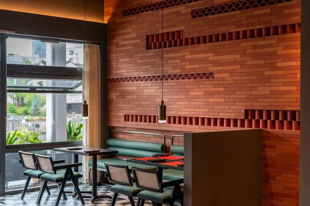 餐厅室内用餐区充满复古巧思,黑白格纹的地面,红砖元素的墙面,桌椅餐具都很有质感。户外用餐区更像是一座私家花园,绿意盎然,氛围安静之余,又很出片。
