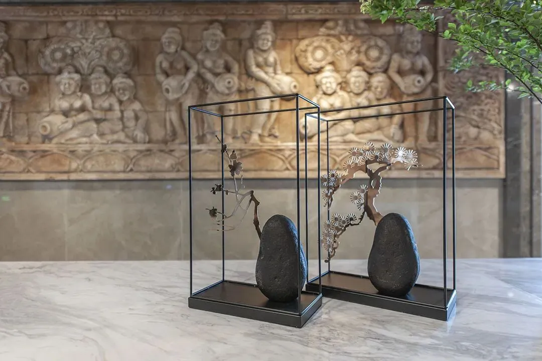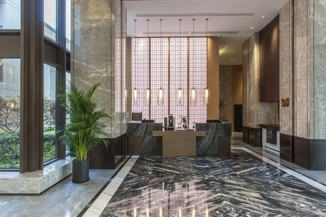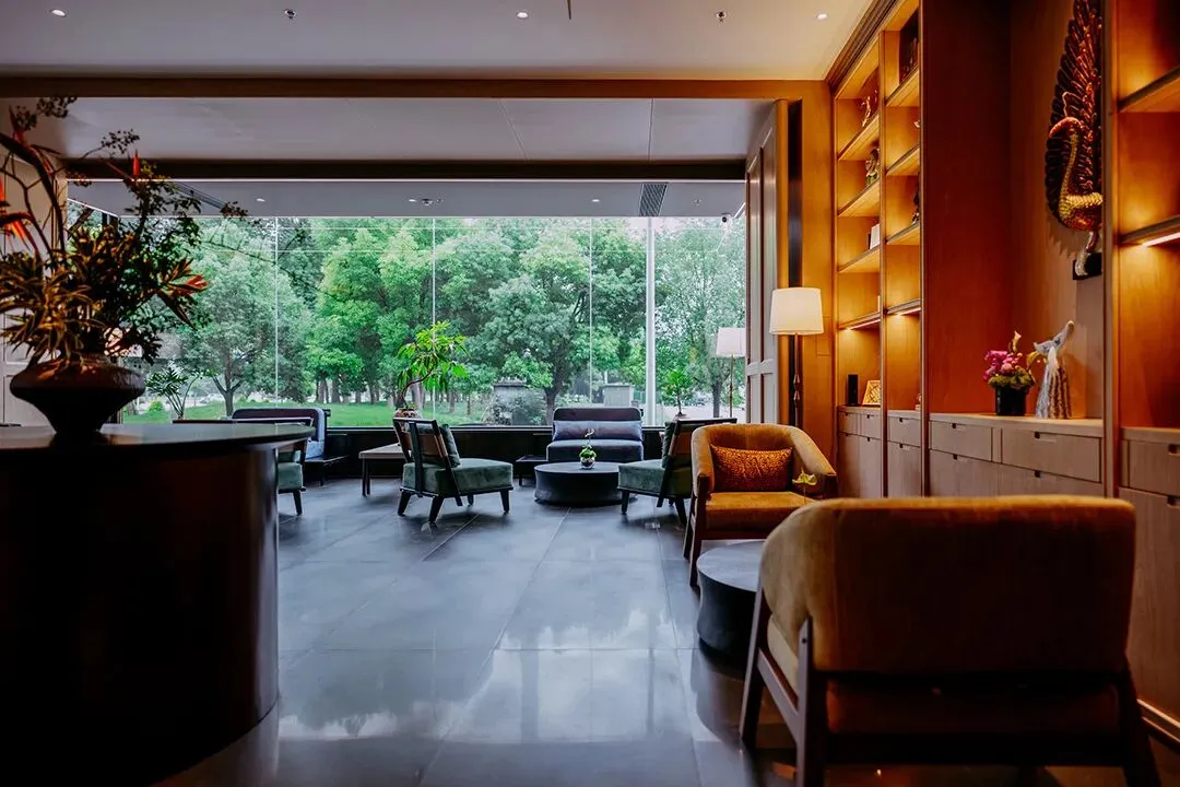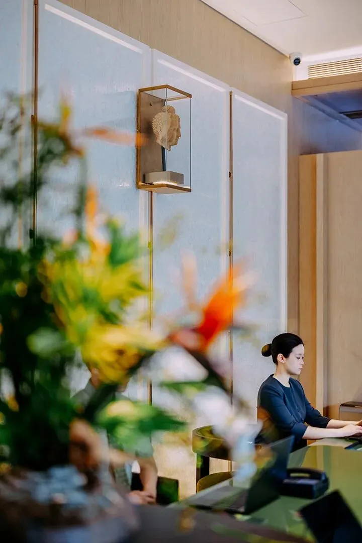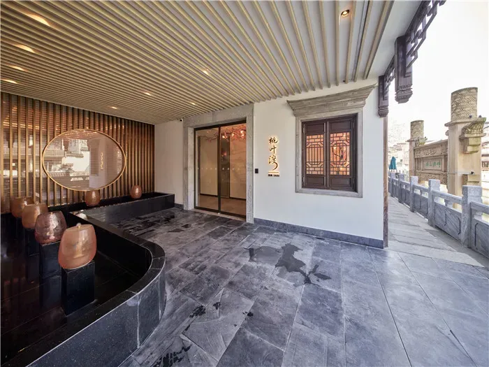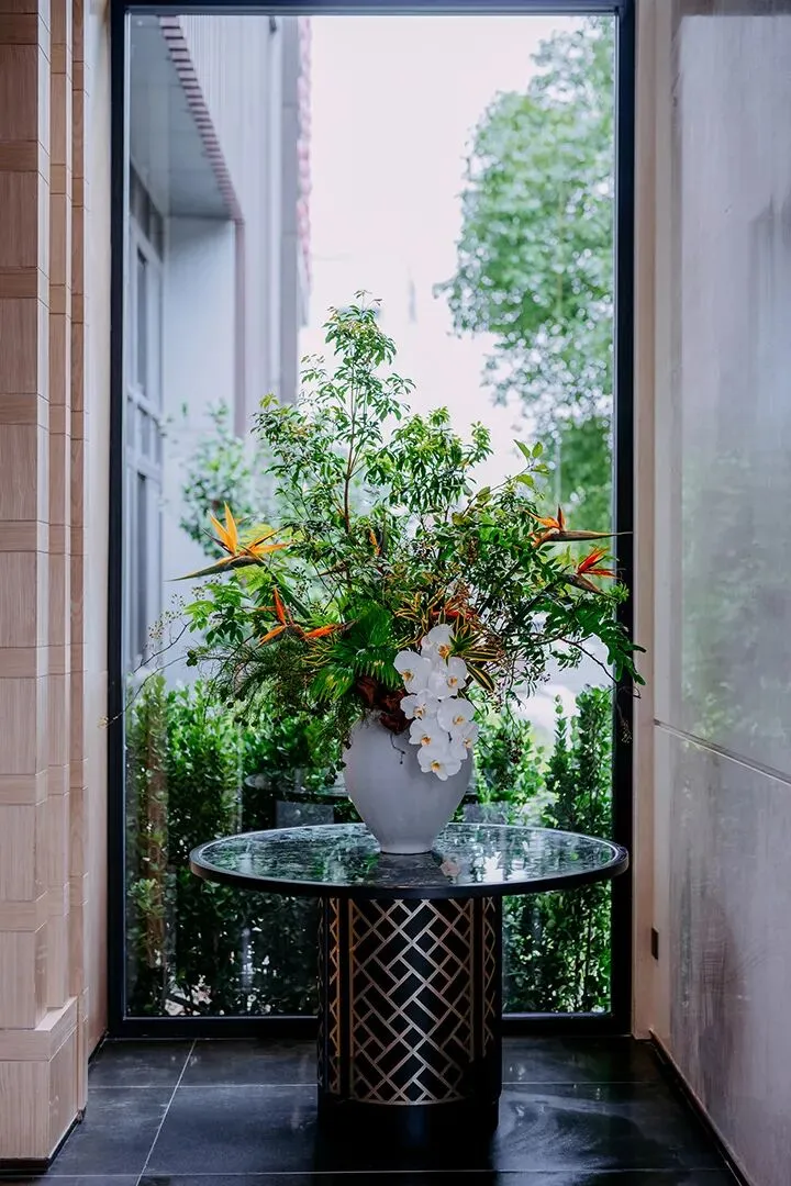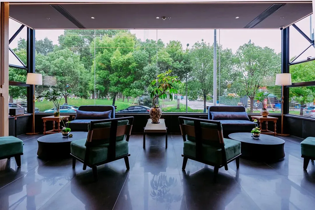 为了契合姑苏的江南韵味,酒店的外观为白墙黛瓦的设计,门头隐逸低调,与周边屋舍融合之余,还在外露的位置,都加入了绿植,让酒店更添生命力。