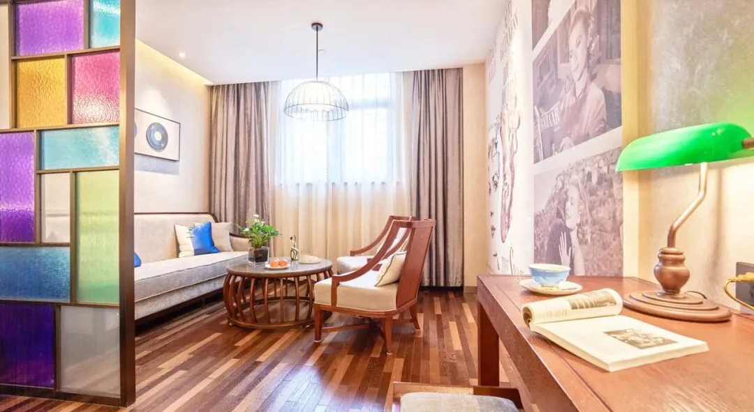 80间客房均以民国电影文化为设计理念,三个系列,三个风格:民国电影,民国风情,民国摄影,每一间都有个性,实木为主的复古主基调,饰以电影海报,世界工艺品等特色元素,既有中国风格的含蓄内敛,又有西洋文化的融合感。