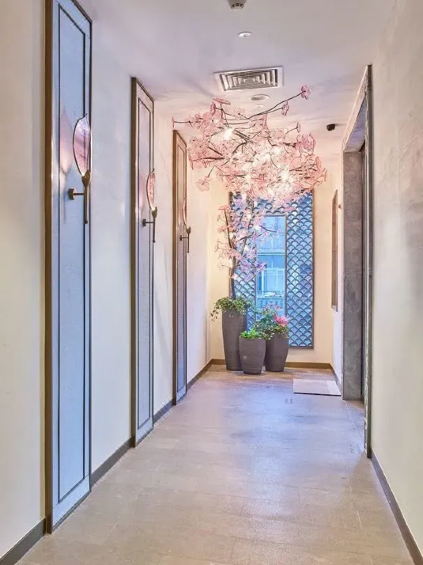 酒店于2021新开,便以桃叶渡的爱情故事作为蓝本,以桃叶和桃叶渡为主题,利用淡雅的配色、复古的家居、桃花形状的灯饰等等,为我们描绘了一个浪漫诗意的居停空间,十分适合情侣入住。