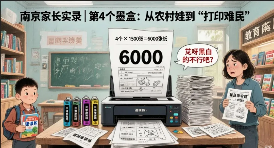 从农村到城市,我原本以为南京的高级教育意味着更高效、更科学。但看着这4个墨盒,我发现我们只是在用更昂贵的成本,复刻了一种更笨拙的懒惰。如果教育只剩下“留痕”,只剩下家长在打印机前的焦头烂额,那我们离真正的育人,恐怕越来越远了。这6000张纸,不该是教育的勋章,而该是一记响亮的耳光。