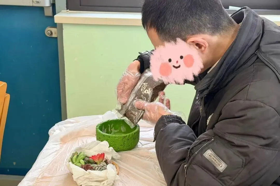 当看到自己亲手种下的多肉稳稳地立在漂亮的花盆里时,每个人的脸上都绽放出了比窗外的阳光还要灿烂的笑容。