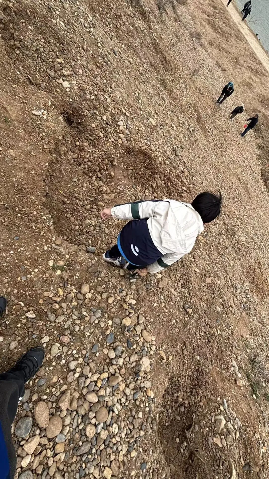 我和儿子挖了大概半小时,准备去水库边上试试,水库边上有一个小山坡,坡里面也是密密麻麻的石头,水库岸边有很多人在捡石头,那边有直接被水冲洗过的雨花石,可以直接看清品质,儿子一个人爬上了坡,在坡上卖力的挖,不一会来水边找我,说挖到了很多好看的石头。