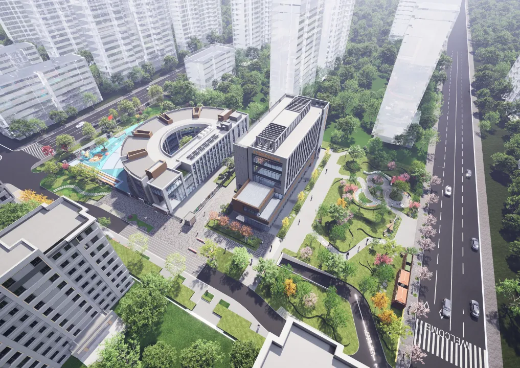 该项目占地2.8万平方米,总建筑面积达9.7万平方米,由4幢建筑组成,最高5层,其中3幢建筑通过空中连廊互通。项目以“功能复合的社区中心、绿色开放的公共空间、多能并用的能源绿谷、全龄友好的健康社区”为目标,打造覆盖医疗、养老、商业、文体、市政服务等多元功能的复合型社区生态。