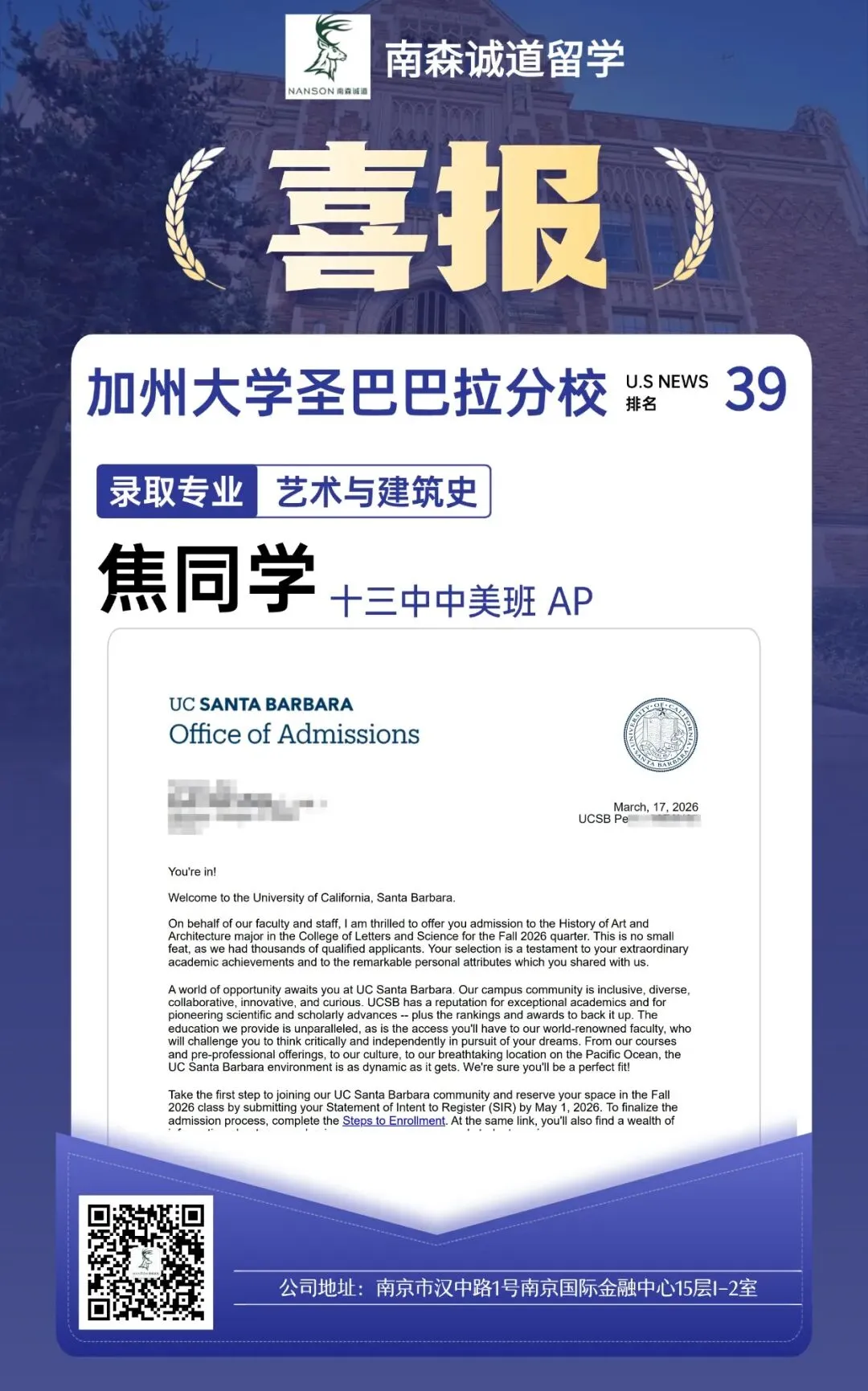 焦同学这份UCSB艺术与建筑史专业的录取,再次证明了“精准规划”与“深度匹配”在美本申请中的核心价值。