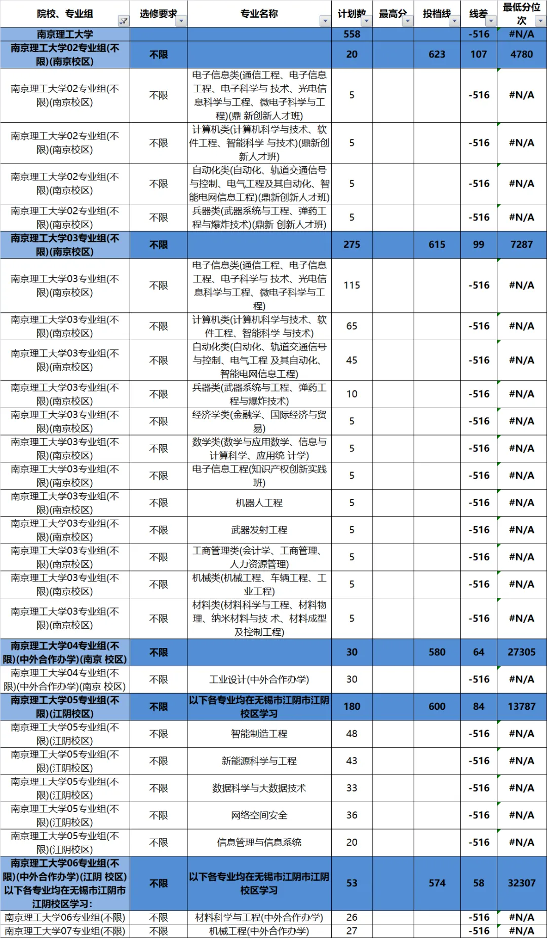 (2)、理科共设置7个专业组含江阴校区和中外合作,共招生603人。投档线最高的是含兵器、机械、计算机、自动化等专业的02组