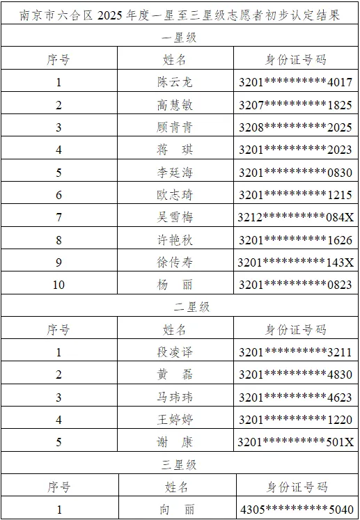 南京市六合区2025年度一星至三星级志愿者初步认定结果公示