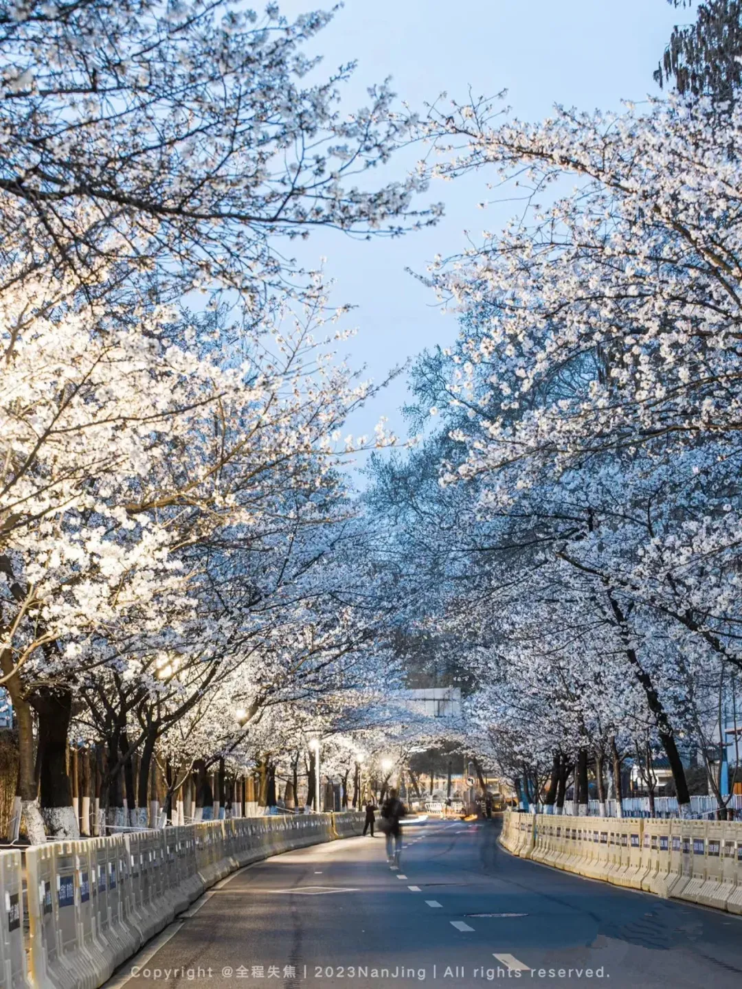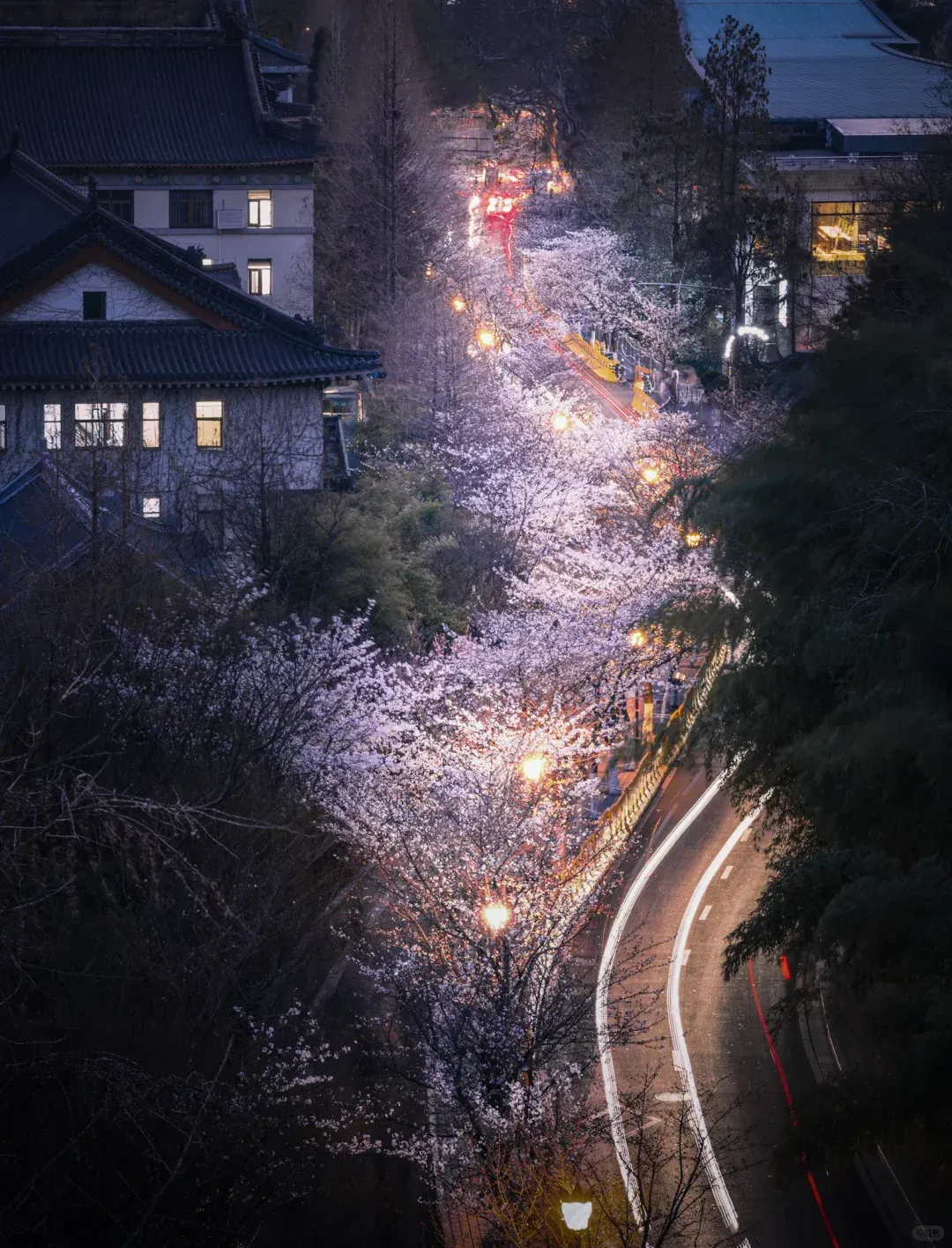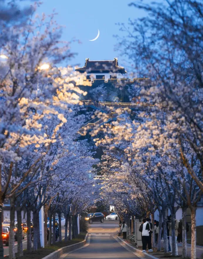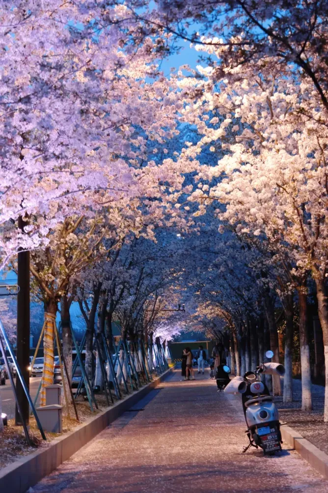 特别是它和鸡鸣寺的建筑同框时,更让这场春天之梦染上了一分古典的色彩。夜幕降临之际,运气好的话碰上亮着灯的药师塔,又是一番别样的体验。樱花大道,绝对是南林大樱花季的绝对主角。想当年,南林大的樱花,也是凭借这条路而火出圈的。
