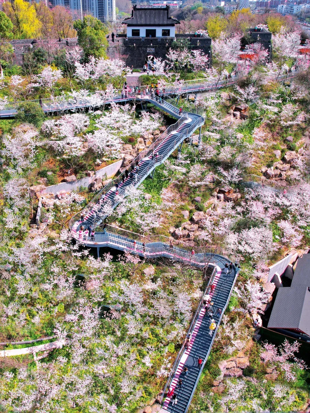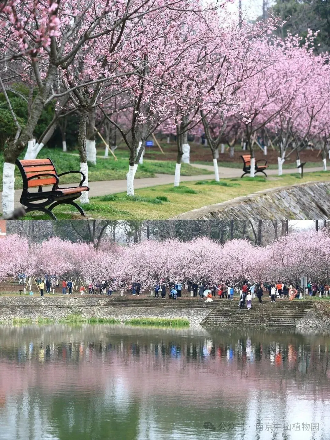 其实很多人都不知道,在中山植物园北园藏着一条绝美的樱花大道。步入樱花大道,近两百株樱花树临水而植,远远望去,粉白嫣红,如霞似锦,春风拂过,花朵轻颤,湖面倒映着岸上的花影,美得像一幅油画。这批抢先“报到”的早樱名为椿寒樱。她们粉白色的花瓣上泛着丝丝“红晕”,在枝头簇拥成团,既有早春的娇羞,又有满树繁花的烂漫 。樱花花期短暂,素有“樱花七日”之说,而椿寒樱的开花日期则是南京樱花中最早的一波。一般在2月底3月初,错过这一波“初美人”的粉色浪漫,就要再等一年了。幕燕滨江风光带樱花观赏区,被誉为“世界最大规模的滨江樱花观赏带”。这条樱花带全长3将近公里,西起五马渡广场,东至燕子矶广场,沿途种植了43个品种、5052株樱花,也是目前国内唯一的“江景樱花”。逛于其中,让人有一种世外桃源的感觉。在这里,幕府山可以与樱花同框,江水可以与樱花同框,南京长江大桥也能和樱花同框!除了有南京最大的樱花海外,还有新晋赏樱顶流:观音门公园。观音门公园的“樱花天梯”盘山而上,远远望去,宛如一条舞动的彩带,极具视觉冲击力。独特的阶梯布景,层层递进,一步一景,可谓是南京最有层次的,樱花观赏地。夜幕降临时,灯光下的樱花流光溢彩,如梦似幻,吸引众多游客前来打卡合影。位于江北的凤滁路,在樱花盛开的时节就变作了一幅粉白色的诗意画卷。