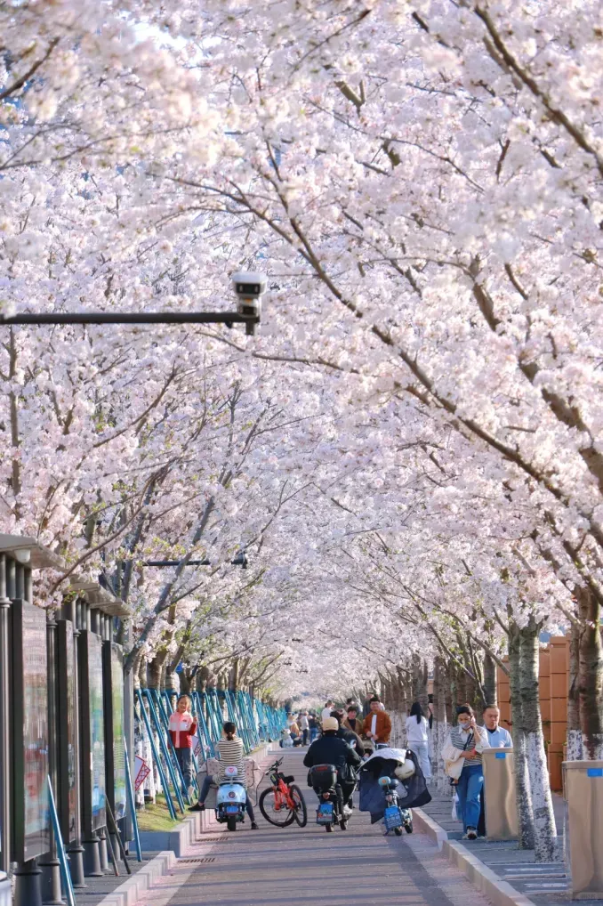 足足两公里的樱花大道,主干路两旁、人行道两旁,四排樱花树挤得满满当当,煞是壮观!