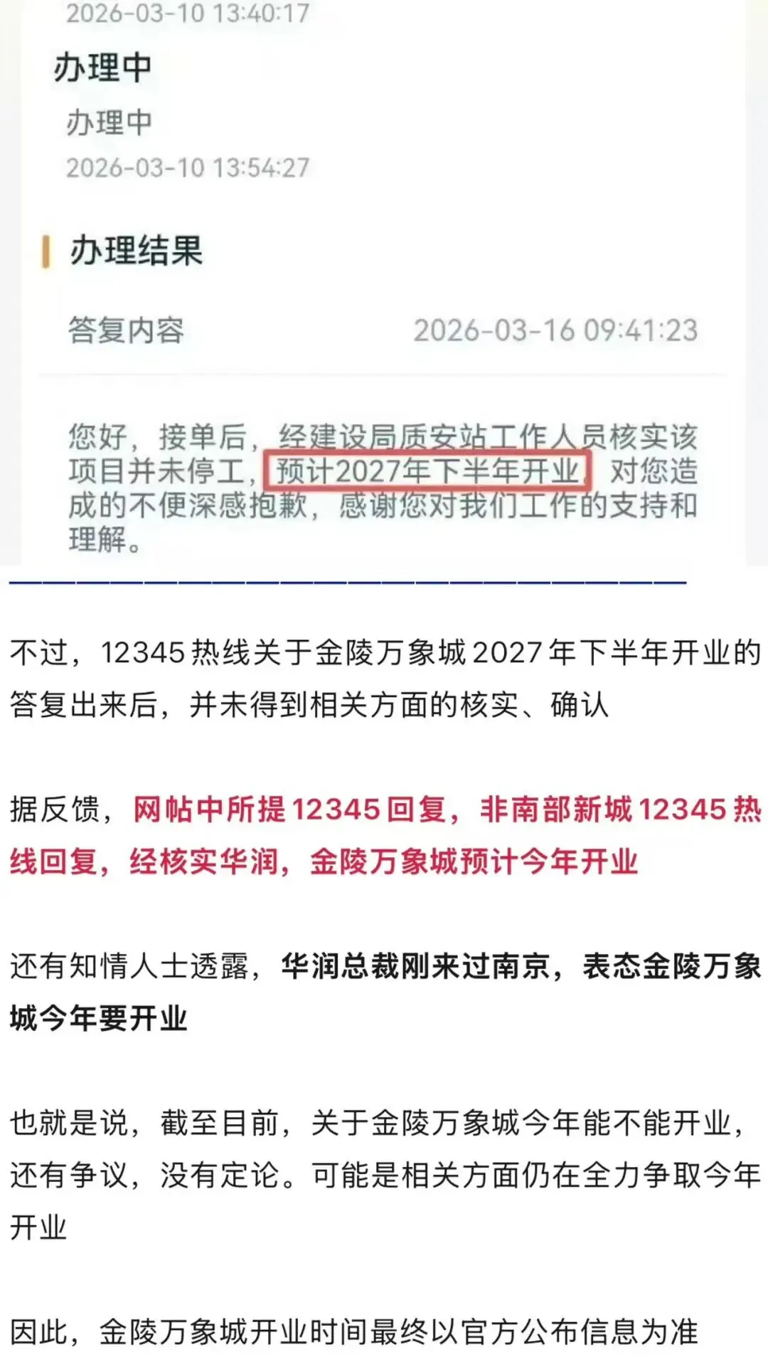 近日,有网友向官方咨询:位于南部新城备受瞩目的金陵万象城是否已停工?什么时候开业?