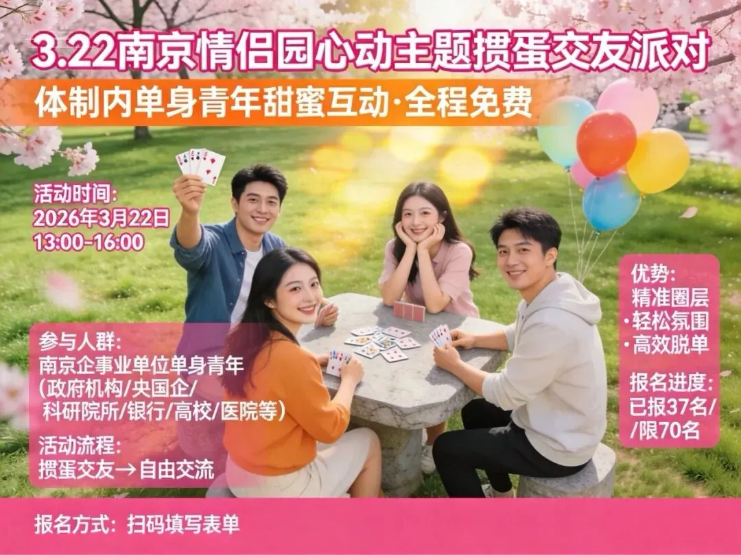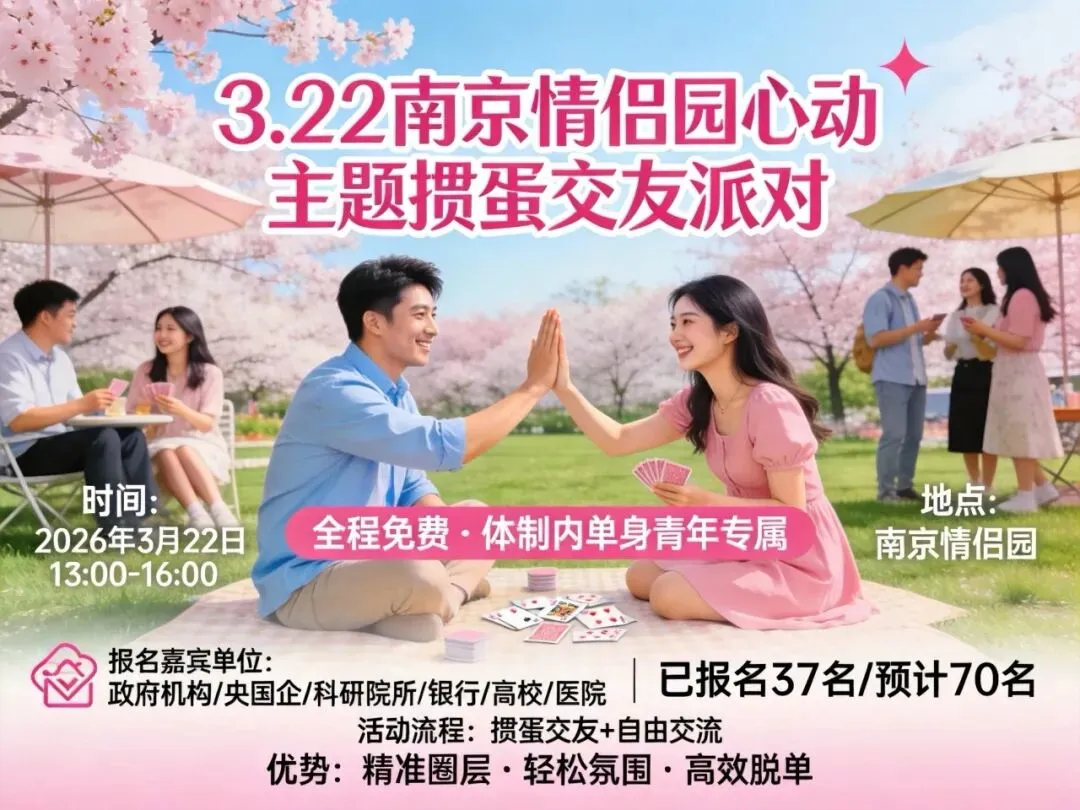 ✅ 自由交流+浪漫场景,心动加倍! 🌸 南京情侣园樱花浪漫绽放,活动特设自由交流区!掼蛋结束后,在樱花树下散步、在草坪上闲聊,氛围感直接拉满!🌸