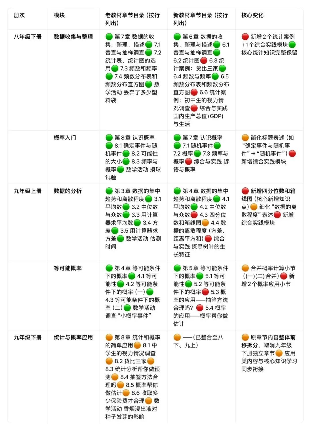 1. 内容整合:原九年级下册统计概率全部前移到八下、九上,不再单独设章。