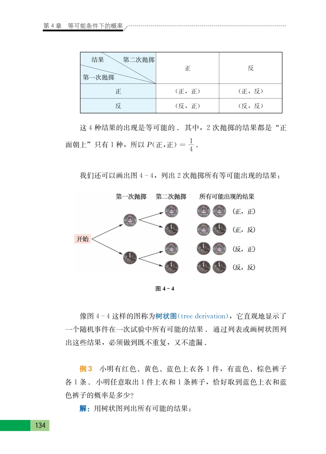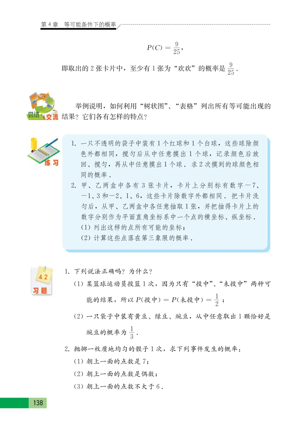 能通过列表、画树状图列出简单随机事件所有可能结果,计算等可能事件的概率。