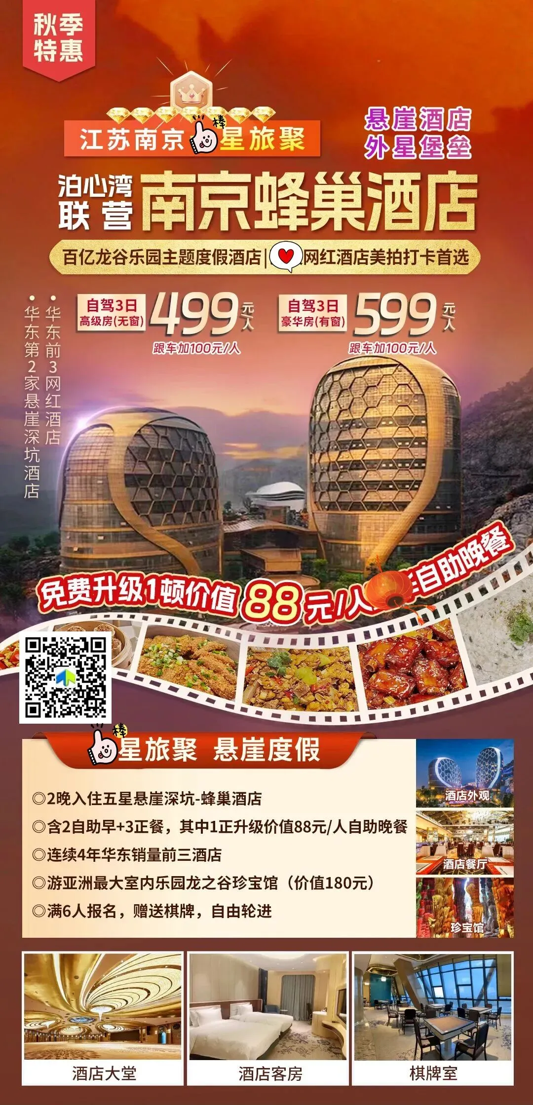 ▲用餐:2早3正餐,其中1正餐升级酒店内价值88元/人自助晚餐,自助餐根据实际情况安排第一天或者第二天晚上享用;如自助餐人数没达到40人开餐人数,则改为1餐价值880/桌(10人计,减人减菜)围桌餐,具体以当团安排为准▲棋牌:满6人报名赠棋牌,自由轮进(营业时间10:00-22:00)▲房差:房差无窗400元/人/2晚,有窗房500元/人/2晚,逢周六加100元,五一加200元,房差只补不退