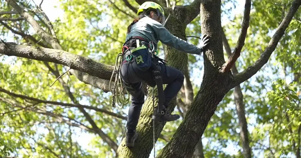 在南京中山植物园,有一群人靠 “爬树” 上班:戴头盔、系绳索、高空穿梭,给大树看病、为生态站岗。