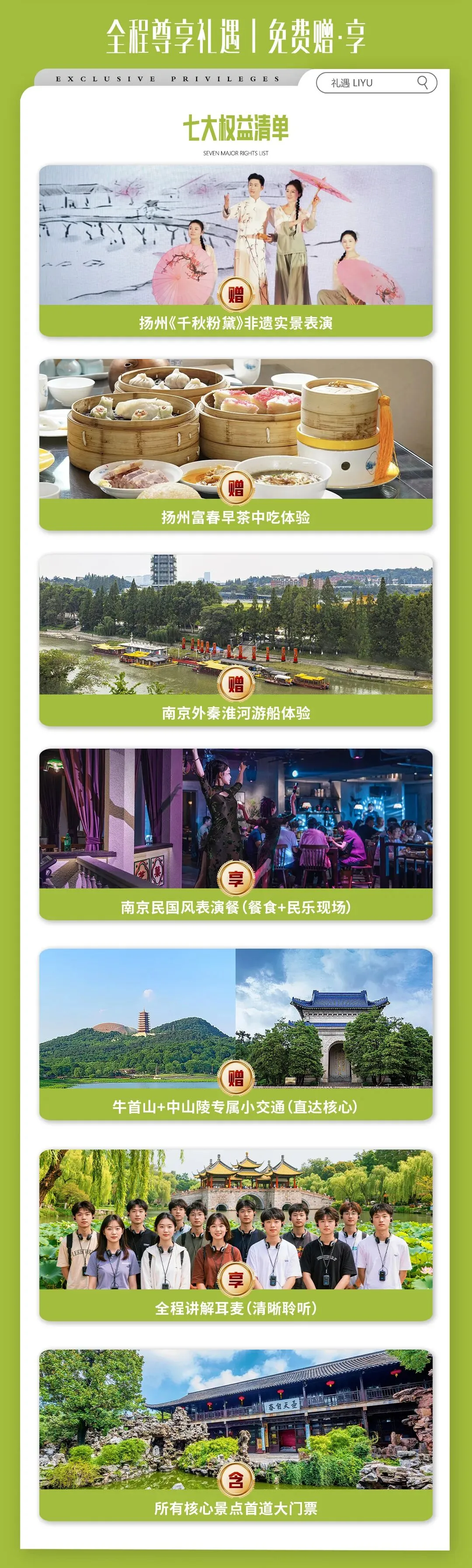 - ✅ 赠送: 景区无线耳麦讲解、牛首山及中山陵景区小交通、扬州富春早茶中吃。