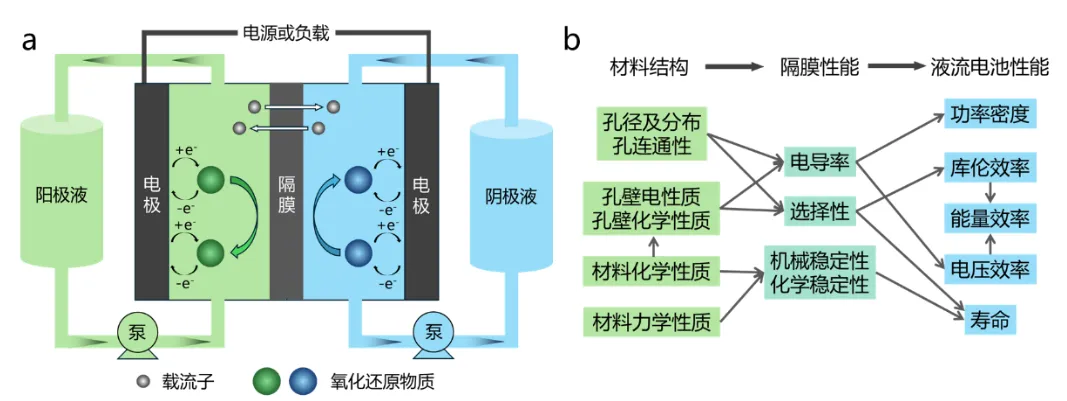 图1液流电池的结构和工作原理(a);材料结构、隔膜性能和液流电池性能的联系(b)