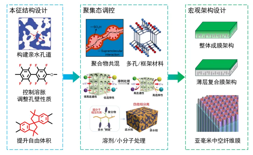 图1为液流电池的结构和工作原理,以及材料结构、隔膜性能和液流电池性能的联系:例如,隔膜材料的孔结构和性质决定隔膜的电导率和选择性,从而影响了液流电池的工作效率和寿命。图2展示了液流电池隔膜的多尺度协同设计策略:在本征结构层面,设计构建亲水孔道、调节孔壁性质、控制溶胀;在聚集态层面,通过共混、掺杂或小分子处理进行调控,在宏观架构层面,构建薄层复合、中空纤维等架构。