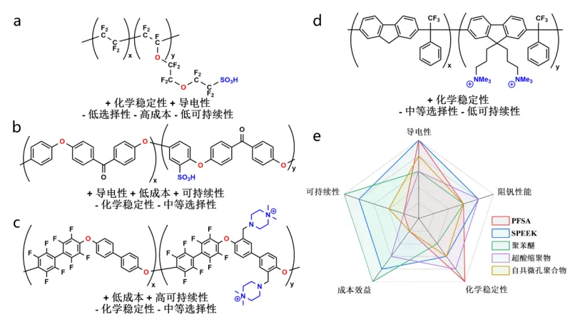 图3 全氟磺酸聚合物(a)、磺化聚醚醚酮(b)、氟化聚联苯醚(c)、全碳主链聚合物(d)的典型结构和性能特点,其中蓝色表示亲水基团,红色表示易降解的位置;不同微相分离膜性能的定性比较(e)