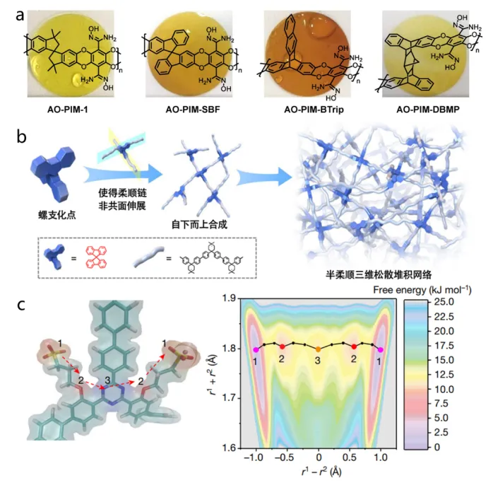 图4 典型的自具微孔聚合物(a);半柔性螺支化聚合物(b);网状聚合物实现低溶剂化离子传输(c)