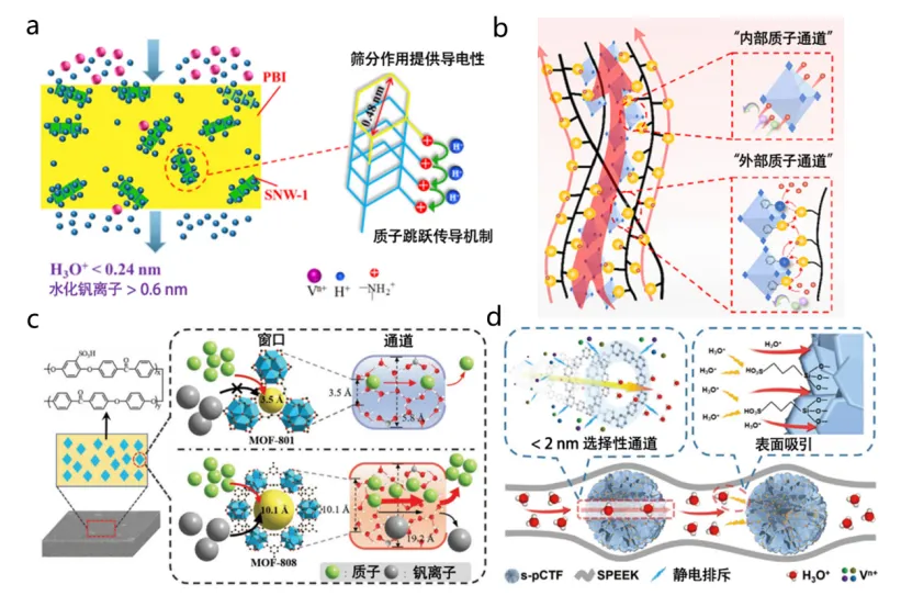图13总结了已有研究在不同尺度上设计优化的液流电池隔膜的性能及在全钒液流电池中的工作性能,直观展示了非对称宏观架构和小分子处理是突破电导率-选择性权衡、设计高性能隔膜的有效设计策略。