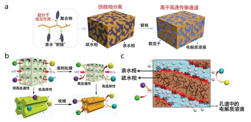 图8 超分子相互作用形成伪微相分离形貌(a);IPA处理缩小孔径提高选择性(b);PES/SPEEK共混形成微相分离结构(c)