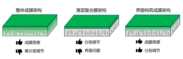 图9为三种非对称膜架构及特点:整体成膜架构是用单一聚合物材料,在膜的垂直方向上实现致密度、孔结构分布及性能分层调控的一类非对称膜结构,制备相对简便,但各层性质不可独立调控,往往难以同时实现最优的选择性与导电性;薄层复合膜架构能够灵活调节皮层与支撑层的特性,从而获得较优的性能匹配,但在界面处可能引入额外阻抗,并存在界面稳定性隐患;界面构筑成膜架构则结合了上述两类的优势,不仅制备简便、层间性质可独立优化,而且由于界面为原位构建,基本避免了额外界面阻抗与稳定性问题,被认为是当前较具前景的架构策略之一。图10、11、12分别是整体成膜、薄层符合、界面构筑和中空纤维膜架构的典型案例。