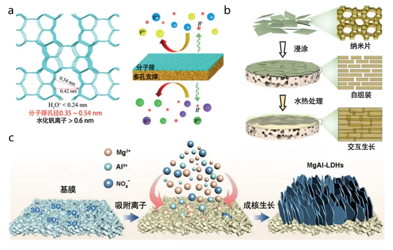 图11 ZSM-35/PES(a)、ZSM-5/α-氧化铝(b)、原位生长垂直LDH(c)薄层复合膜的结构