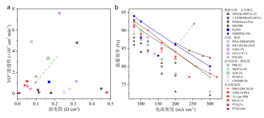 图13 各种VFB隔膜的面电阻(3 mol·L-1 硫酸中)、VO2+渗透性(a);使用各种隔膜的VFB在不同电流密度下的能量效率(b) 虚线箭头表示性能优化的方向