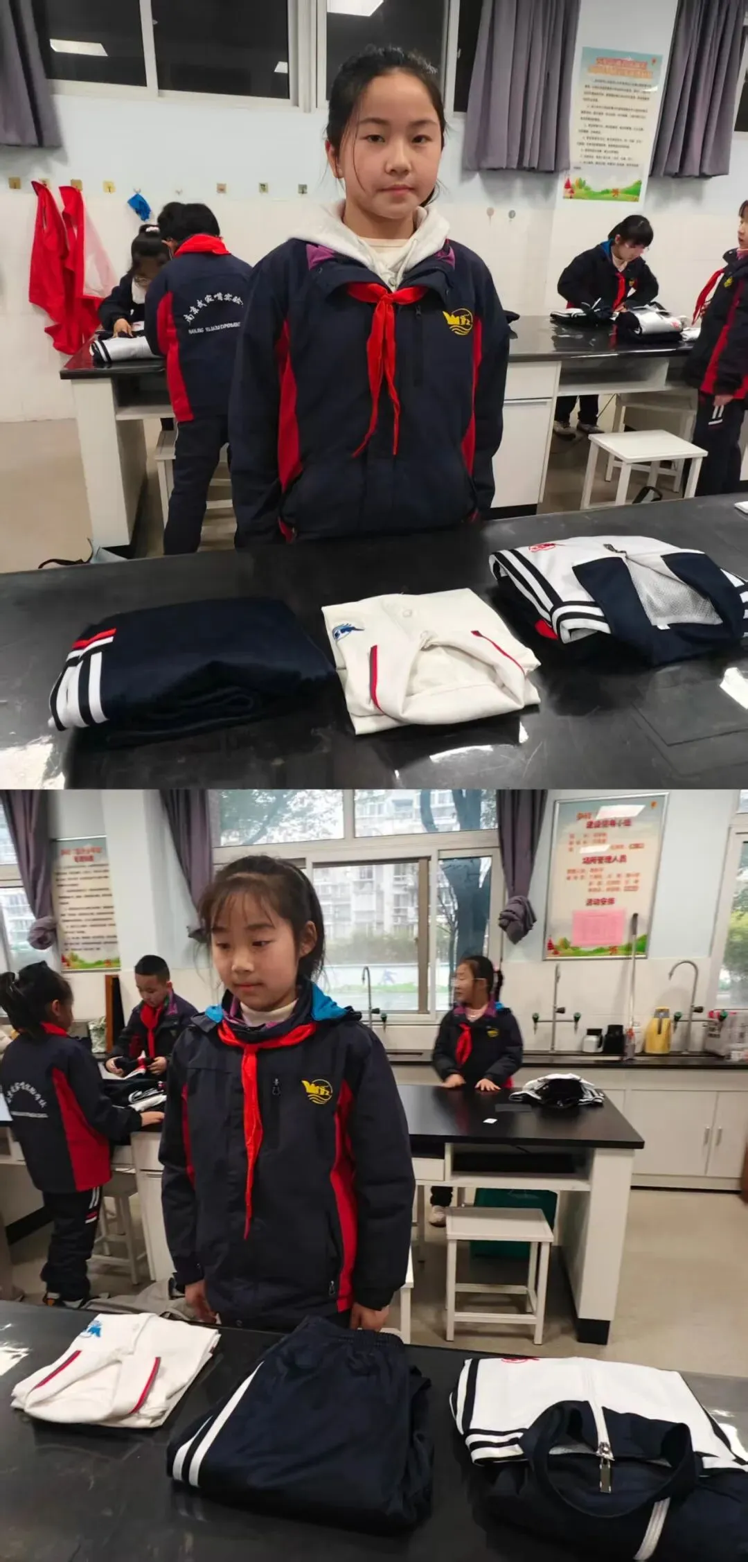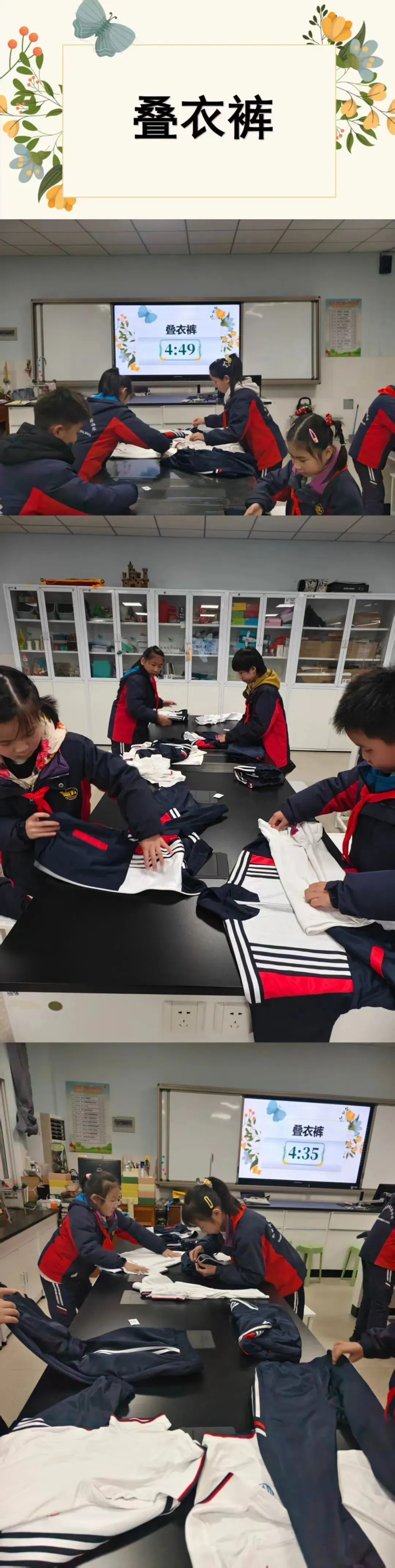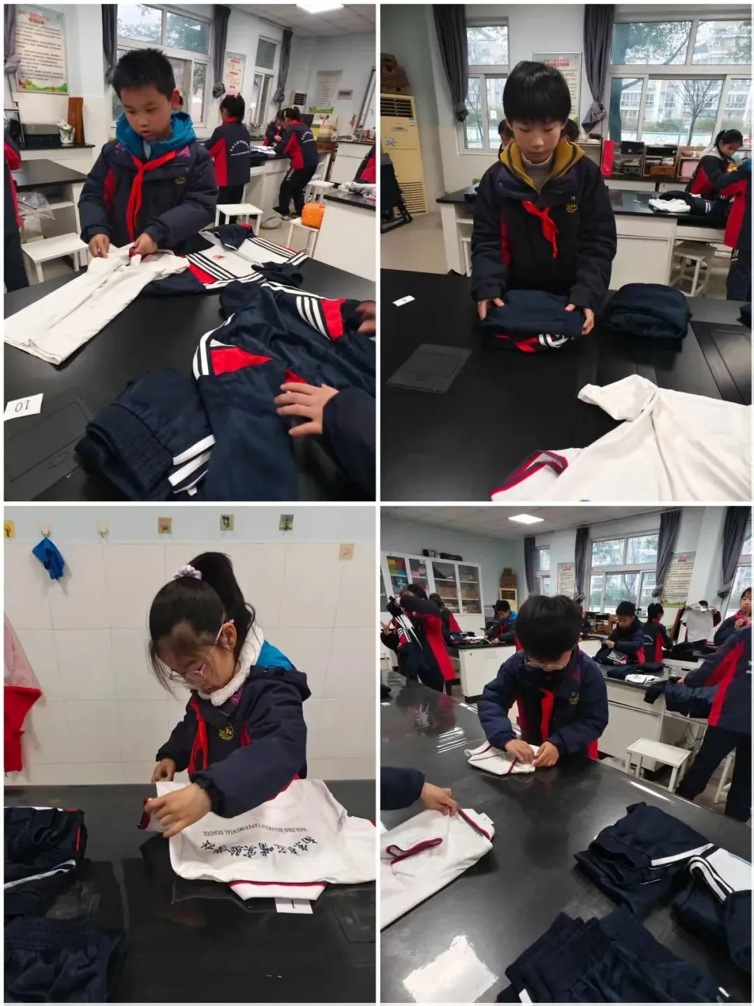 比赛要开始啦,同学们摩拳擦掌,跃跃欲试。随着老师的一声令下,参赛学生迅速打开衣服,铺平,整理衣领、翻面,折叠一侧、拉角翻折衣袖、对折,翻面整理压实,充分展示自己良好的生活自理能力。