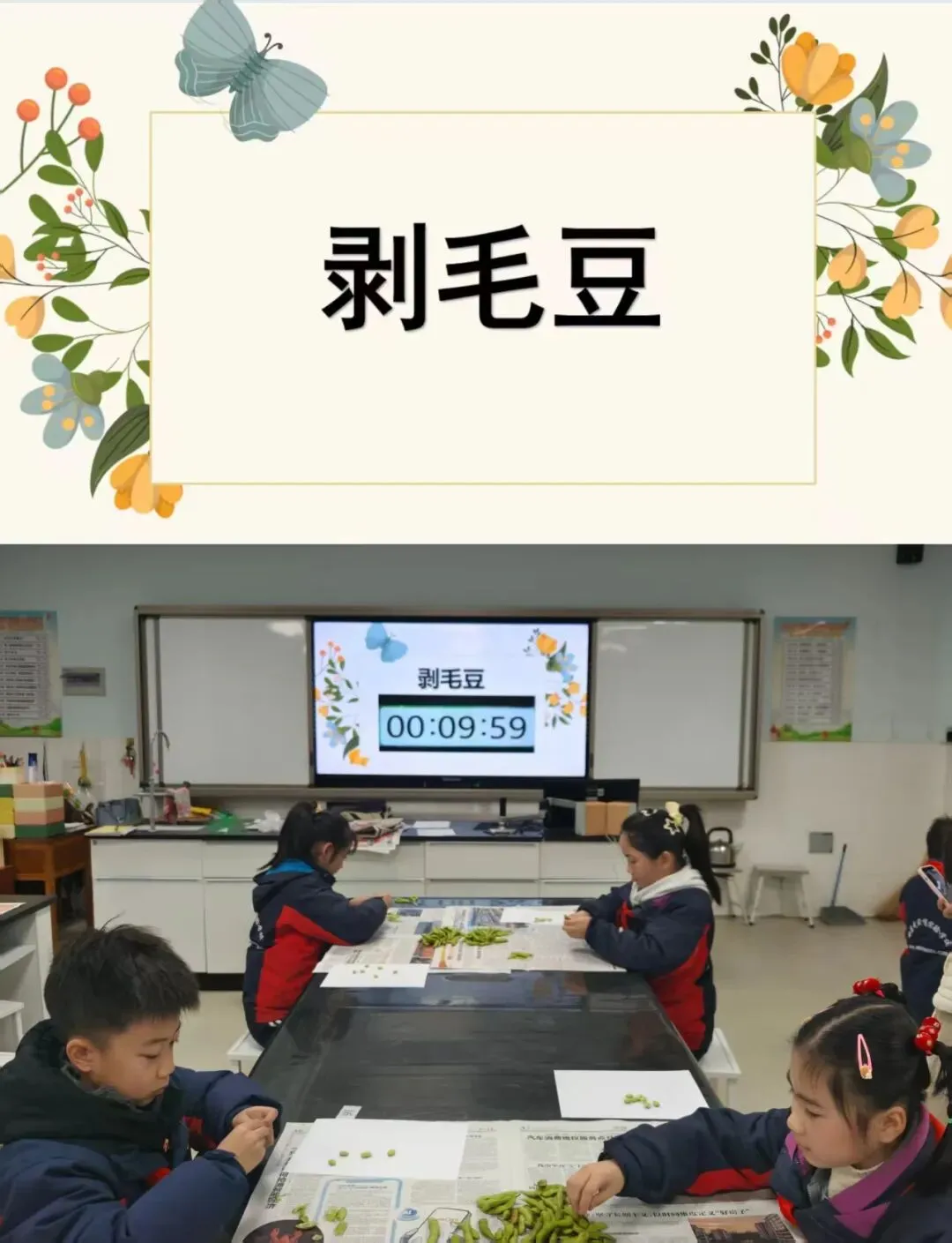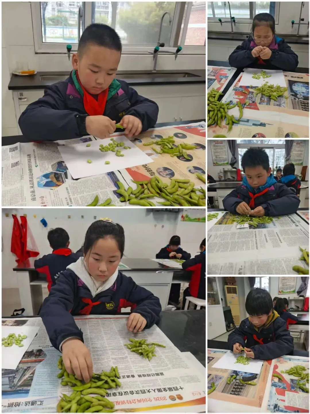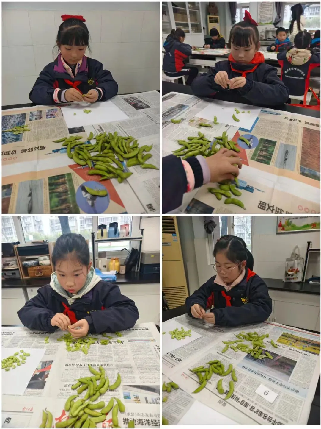 一声“开始”,小选手们拿出了自己的看家本领,一只只拿着鞋带的手在鞋子上飞快地穿梭,动作迅速而灵活小手灵活地缠绕着,流畅自如地系出一个个美丽的蝴蝶结。看到自己的丰硕战果,孩子们脸上绽放出自豪的笑容。教师将事先准备好的毛豆分发给大家,随着一声“开始!”,孩子们纷纷抓起一颗豆子,面带专注,开始了剥豆子的”旅程“。一片片豆壳在孩子们的双手中打开,展现出饱满的豆粒。娴熟的手法、专注的眼神,逐渐堆积的毛豆,孩子们谁也不甘落后,现场气氛异常的热烈。比赛结束了桌上的毛豆壳也收拾得干干净净。