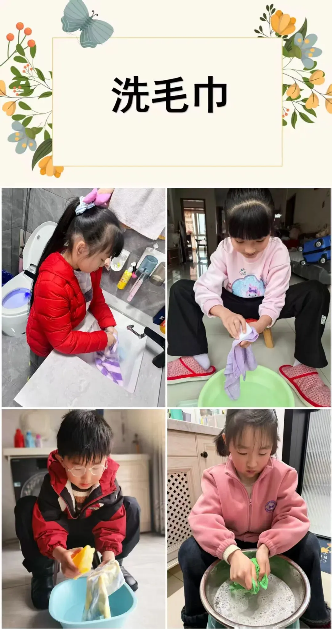 小手动起来,劳动真快乐!打湿、抹皂、揉搓、漂洗……每一块毛巾都在小朋友的手中变得干干净净,从沾满泡沫到清爽柔软,是认真生活的小模样,也是成长里闪闪发光的小骄傲。小小的家务,大大的收获,为勤劳的宝贝们点赞!