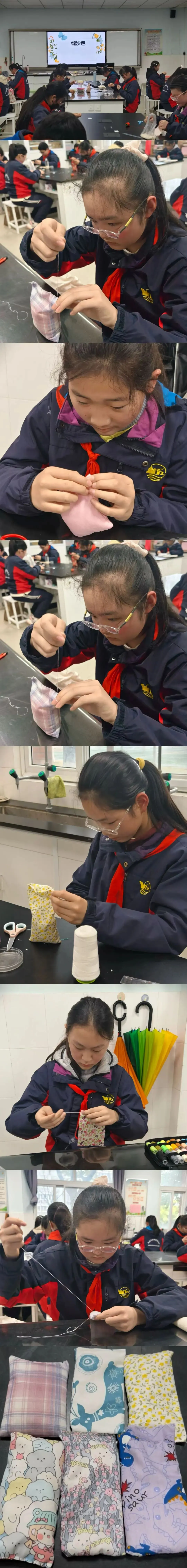 缝沙包比赛开始啦,同学们赶紧拿出事先准备好的针线、布、剪刀、大米等材料,开始制作沙包。孩子们有的剪布料、整理布片,有的穿针引线,有的缝合布块,还有的往沙包里放米。同学们认真专注,针线在手中翻飞,从眼、手、脑的协作劳动中体会着缝纫的乐趣。