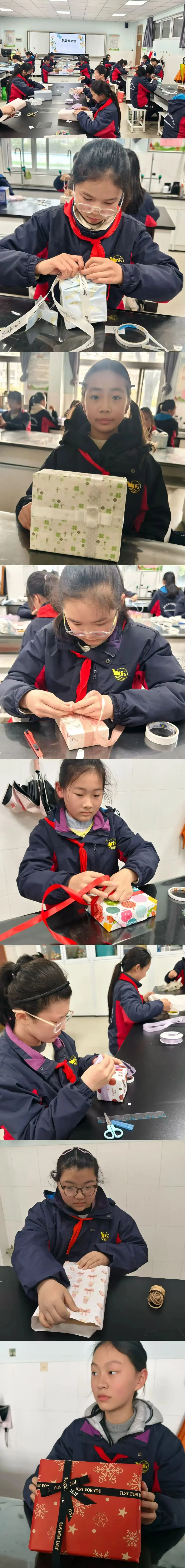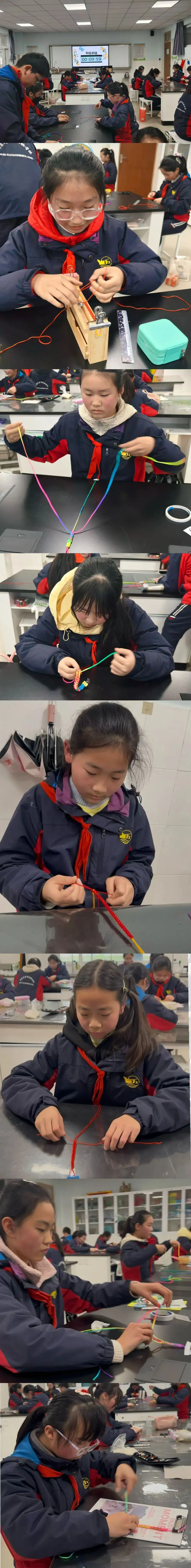 一张彩纸,一根丝带,一双巧手,当这些元素碰撞在一起时,就成为了不一样的改造与创新,孩子们用自己的巧手,让一张张彩纸,变成了精致的礼品盒“外衣”。比赛开始,只见同学们让彩绳确定好位置,左右开弓,巧妙打结……彩线在学生们的手中穿梭飞舞,不一会就呈现出了一条条五颜六色的的平结手链。指尖翻飞捏暖意,小小饺子藏匠心。同学们各显身手,从调馅到成型,他们用双手感受劳动的温度,在烟火气里收获成长与快乐,每一个褶皱里都藏着认真与热爱。一个个饱满的饺子,是劳动的成果,更是成长的勋章。